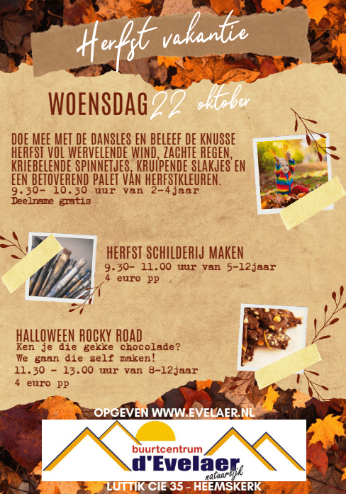 Maandag 20 oktober t/m vrijdag 24 oktoberHerfstvakantie, onderwijsgroepen vrij.