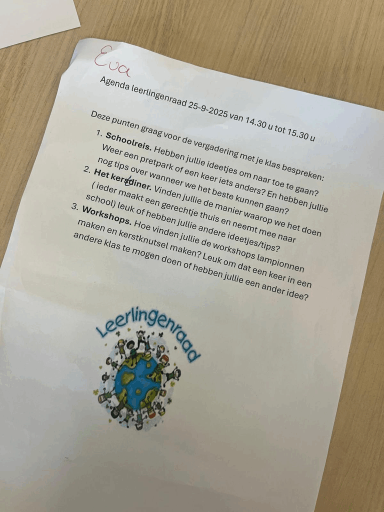 Als Vreedzame School werken wij aan het ontwikkelen van sociale vaardigheden, het bevorderen van autonomie en het stimuleren van democratisch burgerschap. Leerlingen worden gezien, gehoord, hebben een stem en leren samen beslissingen te nemen. Leerlingen voelen zich verantwoordelijk. Om onze leerlingen op een passende manier invloed te geven op de ontwikkelingen binnen onze school, hebben wij een leerlingenraad. De eerste vergadering van dit schooljaar heeft vorige week plaatsgevonden. De leerlingenraad heeft onder andere het schoolreis en de kerstactiviteiten van dit schooljaar besproken.