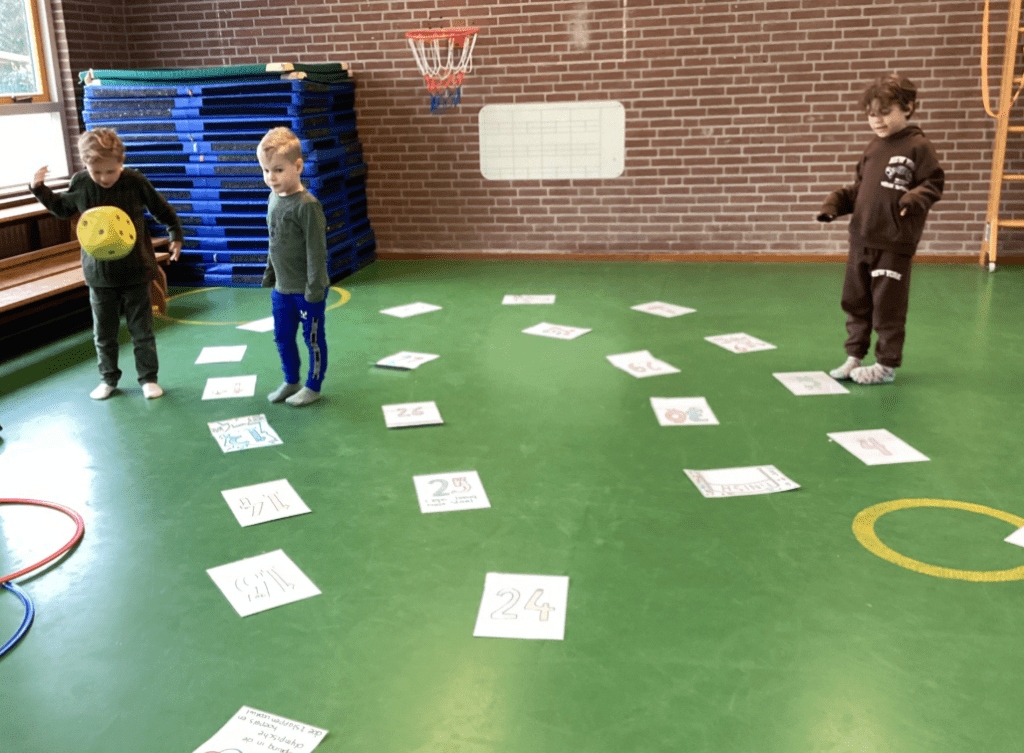 De afgelopen vakantie hebben wij nog een week gewerkt aan het thema de Olympische winterspelen. Hierbij konden de echte Italiaanse pizza’s niet ontbreken. Bij het levend ganzenbord kon je in een wak vallen en moest je wachten tot er iemand voorbij schaatste om je eruit te halen. Ook moest je op een ander nummer een pirouette draaien, zoals een echte ijsdanser(es).